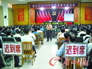 “创新三招”的首次尝试是在8月14日省纪委相关领导为全区各镇及局以上单位正副职干部讲授反腐倡廉辅导课的会议。在授课现场,曲江区为迟到与会人员设立了专门的“迟到席”,凡是当天“上课”迟到的干部都只能坐在这种“专座”上。这一措施效果明显,参加当天会议的人员全部按照规定时间进场完毕。