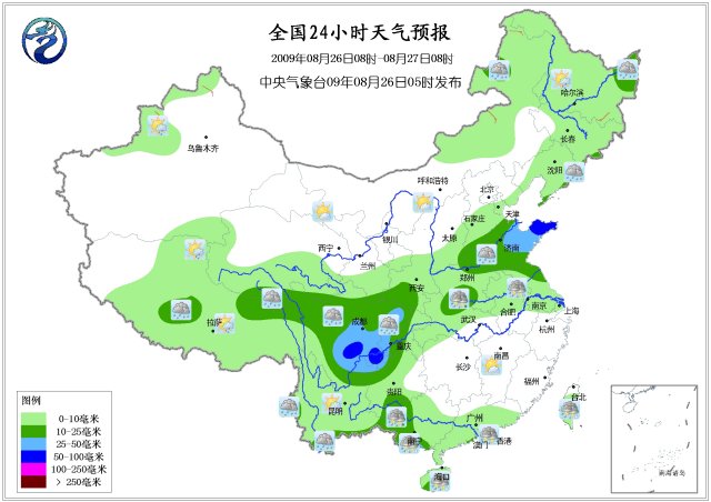 中新网8月26日电 据中国气象局网站消息,中央气象台2009年8月26日06时发布未来三天天气趋势预报称,四川盆地山东半岛等地有较强降水,江南华南等地持续高温。