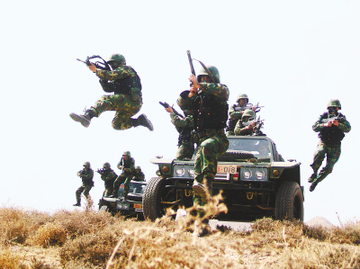 8月19日凌晨,随着两发红色信号弹腾空而起,被誉为“猛虎劲旅”的某特战分队借助薄雾和烟尘遮障搭载武装直升机悄然机降到“敌”后方宿营地。上百辆陆战突击车卷着烟尘正挟雷裹电向攻击行动待机地域实施快速机动,各种火力呼啸着向“敌”目标飞去……一发发愤怒的炮弹砸在“蓝军”阵地上,“蓝军”的防线开始土崩瓦解。