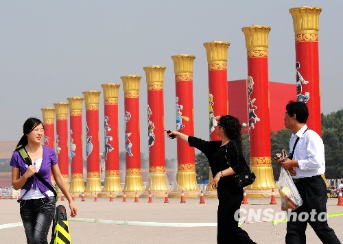 9月14日,伫立在北京天安门广场东侧的民族团结柱吸引游人目光。中新社发 远舟 摄