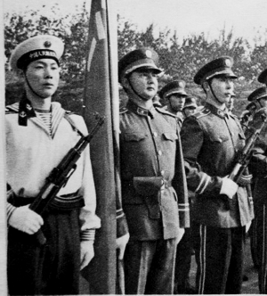 1950年1月,中央军委批准全军实行统一的新军服方案,简称50式军服。10月1日,陆海空三军部队着50式军服受阅。受阅陆军着黄绿色服装,空军着上黄绿下藏蓝色服装,海军着白色服装。陆海空三军佩戴统一制式的帽徽和胸章,整齐划一,面貌一新。新中国成立后人民解放军第一次有了统一制式、统一标准的军服。