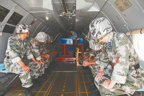 执行空中撒播催化剂任务的是空降兵某团的特种兵们,他们曾多次从这种型号的运输机上练习跳伞,但这次的任务是在规定时间内,快速将消云减雨的催化剂播撒完毕。