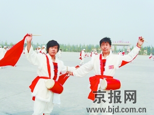 今天天刚一放亮,穿着羊皮坎肩、头顶白毛巾、脚踏白球鞋的腰鼓队员们就陆续来到了基地的操场上。展转腾挪、或前进、或交叉、队员们一个个将腰鼓敲得震天响,响声久久回荡在京城西南郊上空;红绸子在这些西北汉子的手中也有了生命,或飞扬,或飘逸,一片片红色将队员头上的天空尽情渲染。