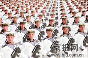 踏着波涛的节奏,携五大洋的雄风,步起步落,云飞浪涌,共和国年轻水兵将走过天安门。