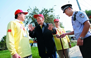 104岁的傅漪泉老人(左二)佩戴“红袖标”上街巡逻。记者 张涛 摄