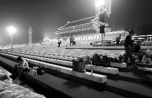 昨日,天安门城楼前东西两侧、人民大会堂北门外临时观礼台上,工人开始加装长凳,并铺设红色地毯。前日,孙中山像亮相广场。