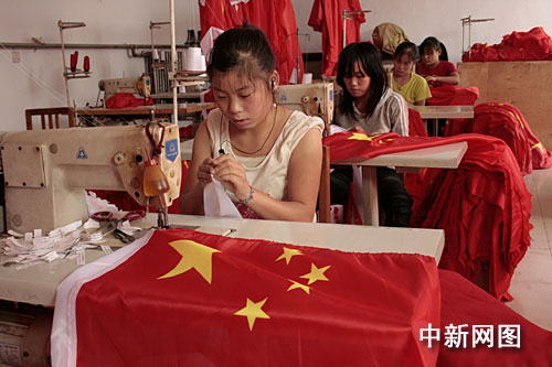 “哈尔滨、沈阳、乌鲁木齐、长沙、武汉、广州、合肥、郑州的批发市场上都有我们厂生产的国旗,今年订单最多的是成都和乌鲁木齐,我们厂一半以上的国旗都发往那里。”藁城市灿烂星光旗帜厂厂长苏振国告诉记者。
