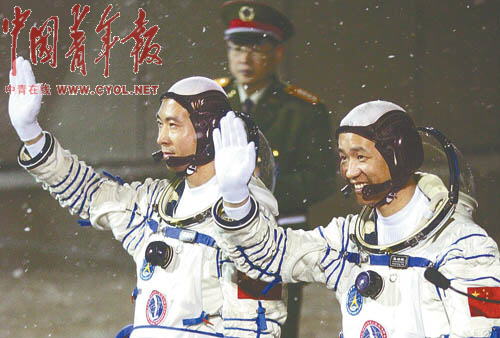 2005年10月12日晨5时,即将搭乘神舟六号飞往太空的航天员费俊龙(左)、聂海胜在酒泉卫星发射中心问天阁前,向冒雪前来送行的各界人士挥手道别。9时整,神舟六号点火升空。10月17日成功返回。记者 郑萍萍摄
