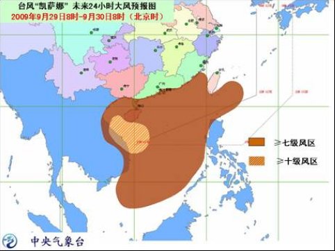 受“凯萨娜”及其外围云系的影响,29日白天到夜间,南海大部海面、北部湾海面、琼州海峡、海南沿海、广西沿海将有7~9级大风,“凯萨娜”中心经过的附近海面或地区的风力将有10~13级大风,阵风可达14~16级;巴士海峡、巴林塘海峡、台湾海峡、台湾以东海面、广东沿海、福建中南部沿海也将有6~7级大风,阵风可达8~9级;浙江东南部、福建东部、台湾、广东南部、海南等地有大雨或暴雨,海南南部的局部地区有大暴雨或特大暴雨。
