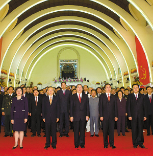 为热烈庆祝伟大的中华人民共和国成立60周年,上海市市长韩正昨晚在上海展览中心举行盛大国庆招待会,中共中央政治局委员、上海市委书记俞正声与800位中外来宾欢聚一堂,共庆共和国伟大光辉的节日。