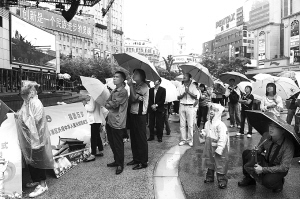 市民冒雨在街头观看阅兵式电视直播 雍和 摄