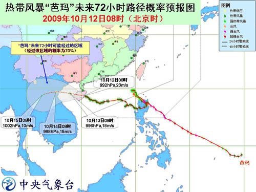 预计,“芭玛”将以每小时15公里左右的速度继续向西偏北方向移动,强度略有减弱,穿过海南岛后,将于12日晚上到13日凌晨进入北部湾海面。