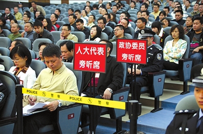 在一中院庭审现场,有20余名市人大代表和政协委员坐在旁听席上,他们是专门受邀进行现场监督。据悉,起诉到各中院或上诉至市高院的重点“涉黑涉恶”案件的庭审均将邀请人大代表、政协委员现场监督。