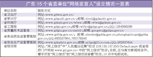 (广东)省委办公厅第二次网友集中反映问题交办会要求首批设立“网络发言人”的l5个省直单位,至昨天已全部设立“网络发言人”,并开始履行职责。这标志着广东在建立网络发言人制度上迈出实质性步伐。