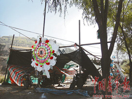 10月20日上午11时许,山西省吕梁市临县林家坪镇白家峁村。村口不远靠近公路的空地上,有几个用棚布搭起的简易帐篷,有的被烧得只剩下几块破布,在秋风中无力地摇曳着。这是几个月前村民为护矿搭起来的,现在成了村民郝兔照的灵堂。他的棺材已经在这里放了8天,旁边摆放着花圈、供品。