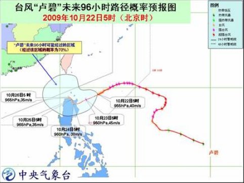 受“卢碧”和南下冷空气的共同影响,22日白天至夜间,台湾以东洋面、台湾海峡、巴士海峡、巴林塘海峡、台湾沿海将有8-10级大风,部分海域或地区阵风可达11-12级;“卢碧”中心经过的附近海域的风力有11-14级,阵风可达15-16级;东海南部、南海北部、浙江东南部沿海、福建沿海、广东中东部沿海也将有7-8级大风,部分海域或地区阵风可达9-10级;台湾东部和北部沿海的部分地区将有阵雨。