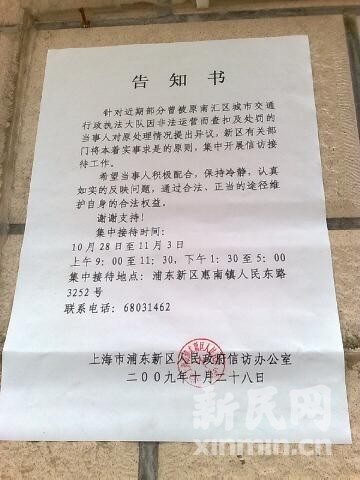 上海新民网今日透露以上信息。据报道,一份28日由上海市浦东新区人民政府信访办公室出具的告知书称:“针对近期部分曾被原南汇区城市交通行政执法大队因非法运营而查扣及处罚的当事人对原处理情况提出异议,新区有关部门将本着实事求是的原则,集中开展信访接待工作。”