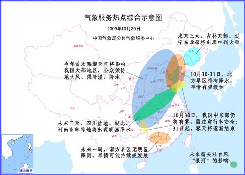 中新网10月30日电 据中国气象局网站消息,未来三天,中国北方大部地区将会有5~7级偏北大风,华北大部、西北地区东南部、西南地区东部、江淮、江南北部将出现小到中雨(雪)天气,最低气温将跌至2℃以下。气象专家提醒,出行时应格外注意,另外,要做好防寒防冻工作。