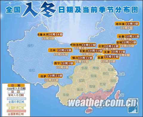 受寒潮影响,银川、北京、天津、太原、石家庄五大城市从10月31日开始气温频频滑落。10月30日,这五大城市的日平均气温还在10℃以上,31日便已分别降至8.3℃、8.2℃、6.5℃、9.6℃和8.4℃,到昨天(11月4日),上述城市的日平均气温已连续5天低于10℃,达到气象意义上的入冬标准。也就是说,五大城市在10月31日到11月4日期间同时完成了从秋天到冬天的季节转换。(气象学上,连续5天日平均气温低于10℃,就算进入冬天,第1天即为入冬之日。)