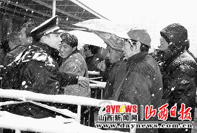11月10日,一场暴雪给出行的人们带来了不便。太原交警支队迅速启动冰、雪、雾恶劣天气应急预案,全警动员,全员上路,保障人们的出行安全。在大南门岗,太原市公安局副局长、交警支队支队长尹喜平在大雪中疏导着,并不时地喊话,提醒大家注意安全。杏花岭交警大队对辖区太原市东客站和太原市客运汽车公司驻站管理。古交交警大队在三岔口和神堂岩执勤点及早安排警力,实施交通管制……(记者曹秀娟)