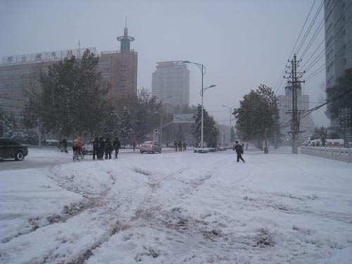 石家庄市区大雪将部分树枝压断,公共交通严重受阻,路上车辆稀少,许多市民只有提前步行上班或送孩子上学。