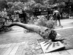 随后,这棵树迎风坠地,树根被连根拔起,发出巨大的砰响声,周边的地砖也被凿裂。当记者赶至现场时看到,这棵大樟树直径约有20公分,高约5米。