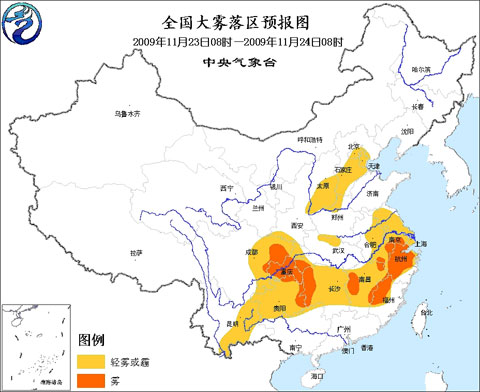 中央气象台23日06时继续发布大雾预报: