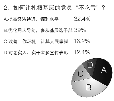 基层比较艰苦,基层比较复杂,被问到“如何让扎根基层的共产党员‘吃苦不吃亏’?”时,39%的受访者更关注用人导向问题,他们认为应该优化用人导向,多从基层选拔领导干部;选择提高经济待遇,福利水平的也占到了32.4%;值得注意的是,“更重视基层,改善工作环境,让其大展拳脚”也受到关注,有16.2%的受访者选择了该选项。
