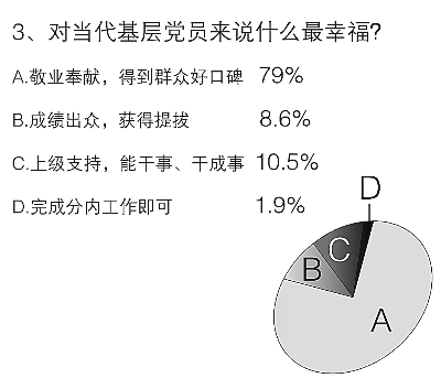 对当代基层党员干部来说,在事业上什么是最幸福的?根据调查,79%的受访者选择了“敬业奉献,得到群众好口碑”,这说明在基层,群众工作是最重要的方面。也有10.5%的干部更希望得到“上级支持,有一个‘能干事,干成事’的氛围”。