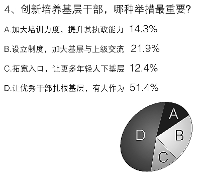 当被问到如何创新基层干部培养方式时,51.4%的受访者选择了“让优秀干部安心扎根基层,有大作为”,这说明基层虽苦,但在基层干部眼中却是锻炼干部最好的大学校,另外也表明了目前基层缺人才的现状,热切呼唤德才兼备的“能人”去领导和管理。要解决这个问题,有21.9%的受访者认为应该设立制度,加大基层与上级干部间交流。同时,12.4%的党员干部把“拓宽入口,让更多年轻人下基层”当作创新基层干部培养的首选。(梁昌杰、王慧)