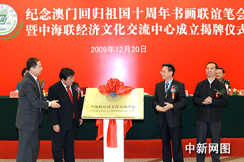 中新网12月21日电 纪念澳门回归十周年书画联谊笔会暨中海联经济文化交流中心成立揭牌仪式于2009年12月20日上午在北京人民大会堂澳门厅举行。