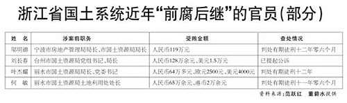 事实上,据统计,不仅是浙江,近年来落马的贪官不少都与房地产潜规则下的腐败有关,财政部原副部长朱志刚,北京市原副市长刘志华,山东省委原副书记、青岛市委原书记杜世成,天津市政法委原副书记、天津市人民检察院原检察长李宝金,湖南省郴州市原市委书记李大伦,安徽省原副省长何闽旭,昆明市规划局原局长曾华,上海房地局原副局长殷国元,江苏省苏州市原副市长姜人杰,重庆市规划局原局长蒋勇,重庆市沙坪坝区原副区长陈明,福州市国土资源局原局长王炳毅,福州市仓山区土地局原局长李仲……都与房地产腐败有关。