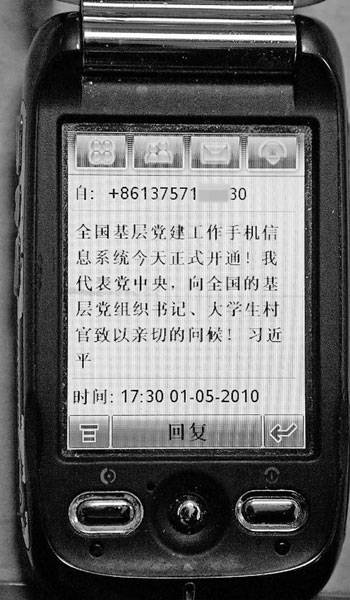 这个温暖的误会,源于全国基层党建工作手机信息系统的开通。当天,中共中央政治局常委、中央书记处书记、国家副主席习近平通过该系统,向全国百名基层党组织书记、大学生“村官”发出了问候短信。而短信几经转发,被截屏后刊登在了报纸上,让更多的人感到了激动和振奋。