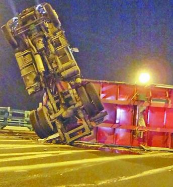 沈海高速公路杭州湾跨海大桥路段宁波方向59KM+800M处,前天(23日)凌晨5点44分,一辆车号重型半挂车在行驶过程中突然失控碰撞边护栏后与中央护栏刮擦,随后整个车子来了个乾坤大挪移后,掉头侧翻横躺在了高速公路上,往宁波方向的整条行车道完全被堵死,赶到现场的高速交警也被吓出一身冷汗。