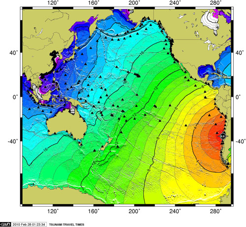 据太平洋海啸警报中心测定:当地时间2010年2月27日凌晨3时34分(北京时间27日14时34分),南美洲智利中部近岸(36.1°S, 72.6°W)发生8.8级地震,震源深度为55公里,震中距智利第二大城市康赛普西翁100公里,距智利首都圣地亚哥320公里。