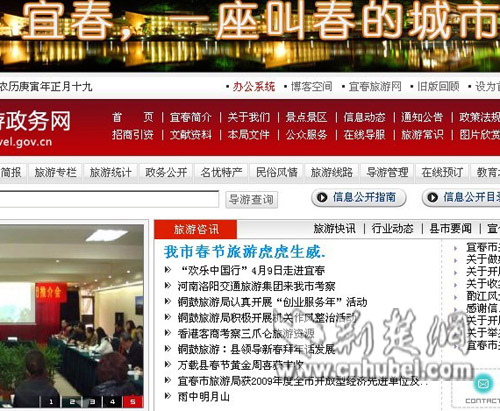 4日下午,荆楚网记者登陆宜春市旅游政务网发现,网站首页banner上,以“宜春,一座叫春的城市”文字滚动出现,而在搜索引擎上,以“宜春,一座叫春的城市”为词条,出现的信息达1700多条。