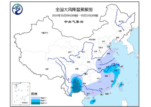 中新网3月9日电 中央气象台3月9日06时继续发布寒潮蓝色预警:9日08时至10日08时,黄淮大部、江淮、江南中东部、华南、四川南部、云南中东部等地将出现6~8℃降温,其中,四川南部、云南东部及贵州西部等地的部分地区降温幅度可达10℃以上,黄淮、江淮中东部、江南中东部及华南等地并伴有4~6级风。10日凌晨,江南大部最低气温可达0至零下3℃,华南中北部2至4℃,华南南部6至7℃。