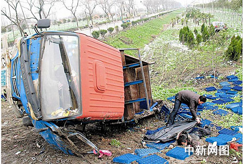 在事发现场,变型拖拉机已被吊车悬在田埂边,死者趴在车旁的泥土中,周围散落着上百只塑料筐及齿轮。距离变型拖拉机约10米远的农田里,停着一辆黑色镇江牌照的轿车,车身有毁损。几名交警正忙着勘查现场,指挥交通。