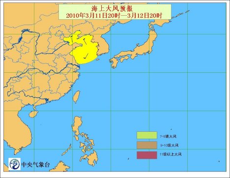 预计,11日20时至12日20时,受冷空气的影响,渤海将有7~8级、阵风9级偏北风;黄海大部海域将有7~8级、阵风9级的西南风转偏北风;东海北部海域将有6~7级西南风。其他海域天气海况条件较好。