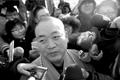 每次人大代表“走红地毯”时,圆脸方耳、身穿黄色袈裟、足蹬黑色布鞋的全国人大代表、少林寺方丈释永信一出现在广场上就会被记者团团包围,“方丈,听说你开越野车”“方丈,你现在是住在大别墅了吧?”……面对大家抛出的各种问题,他不急不恼,边低声念“阿弥陀佛”边试图向密不透风的人墙外移动。见叱咤少林寺的大师却被众人围堵得步履维艰,好事者喊了句“大师,用轻功啊”!大师就是大师,面对记者们刁钻的问题,他往往用微笑代替回答,“我知道,就算我不说话,也会成为新闻”。