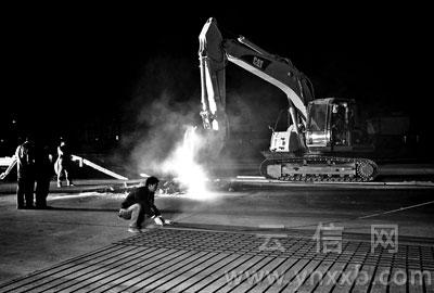 15日深夜,从版纳飞抵昆明的航班降落在昆明机场后,跑道边灯准时熄灭,钟表指针恰好重叠,16日零时。25分钟后,挖掘机、搅拌机、交通车等聚集在了机场跑道1900米处(北向南),照明车射出的白光将人影拉得很长。