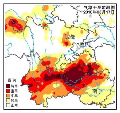 中新网3月17日电 中央气象台3月17日继续发布干旱黄色预警:根据3月17日监测,云南大部、贵州中部和西南部、川西高原南部和广西西北部等地维持气象干旱重旱等级。18日,云南西北部、广西东部有小阵雨,未来三天,其余旱区无降水。云南大部、贵州大部、川西高原南部、广西西北部等地的气象干旱将持续或发展。