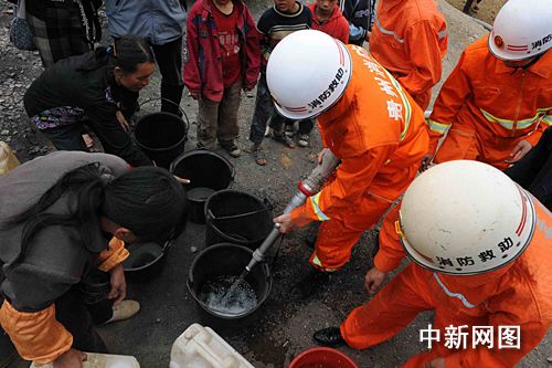 中新网兴义3月29日电 (记者 曹多然)28日,贵州省兴义市消防官兵出动消防车,为该市受旱灾影响的乌沙镇普梯村送去约10吨生活用水。