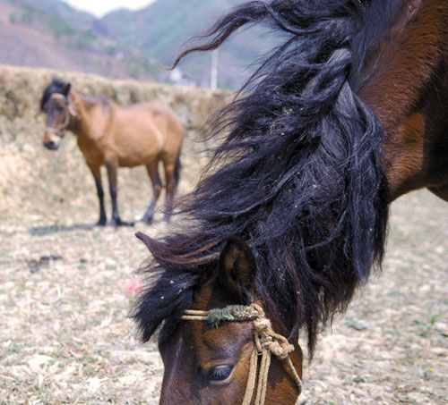 马啃着地上的干草,它的毛也因干旱缺食而变得干枯