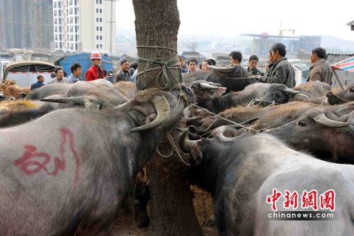 近中午时间,市场里买卖的人群还未散去。秦大章夫妇牵着刚买的牛回家了,这得花上2、3个小时的时间。回到家,喂牛的水又是一个问题,“没干净水够它喝,只能像邻居那样把洗菜、洗脸脚的水留下给牛喝。”秦大章的妻子说。虽然羡慕村里有人可以用机器耕地,但家里的4、5亩地多在石头丛生的半山腰上,秦家夫妇还是只能选择最传统的牛耕方式。