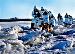 大雪纷飞。雪茫茫,冰寒寒。身穿雪地迷彩伪装作训服的新疆军区某红军师官兵挺进雪域天山,实施高寒条件下检验性战术对抗演练。数千名官兵、数百台车辆在风雪高原摆兵布阵,穿戈壁,踏冰雪。从师团指挥员到连队战士,人人融入战场环境,个个进入战斗角色,在茫茫雪野中从难从严真打实练。