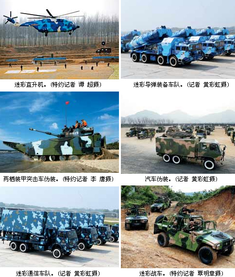 现代战争不仅需要迷彩军服伪装,更需要迷彩装备伪装。在军车、坦克、战舰和战机上利用迷彩颜色来隐藏这些装备的实际轮廓,降低战斗装备的可见性,就能增强这些装备的有效作战能力。