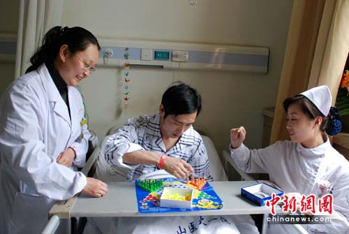 山大一院综合科的第3病室里,42床的高二辉正在和心理治疗师樊艳丽、护士段瑞云下跳棋。