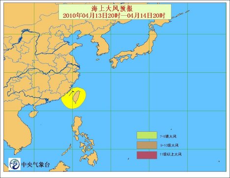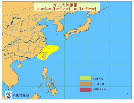 中新网4月12日电 中央气象台12日18时继续发布海上大风预报:4月12日下午2时,渤海、黄海北部和和中部海域、东海北部海域出现了5~6级、阵风7~8级的西北风;东海南部偏东海域、台湾以东洋面出现了5~7级西南风;南海西北部海域、北部湾出现了5~6级偏南风。黄海大部海域、东海西部海域、台湾海峡、南海西北部海域的能见度不足10公里。其他海域天气海况条件较好。