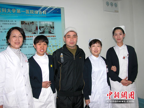 山大一院综合科的病房里和走廊间,出院的工友们与医护人员依依道别。